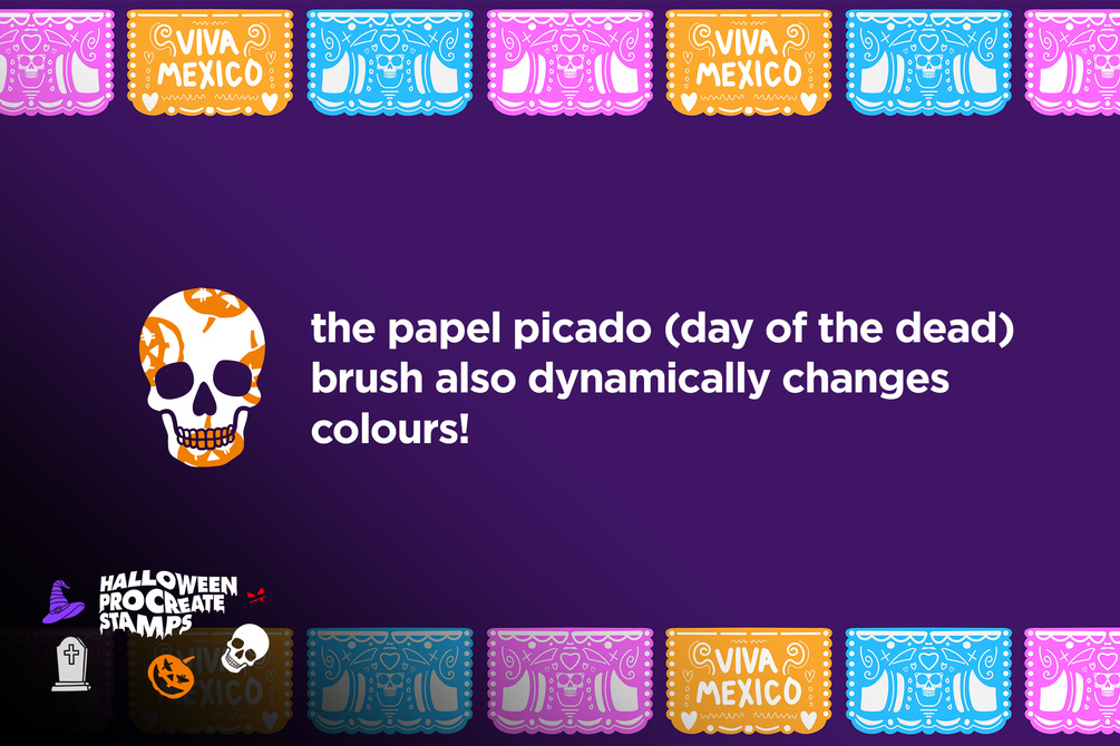 πŸ’€ The brushes include skull, pumpkin, gravestone, witches hat, cobwebs, evil face, bats, mexican day of the dead papel picado and much more!